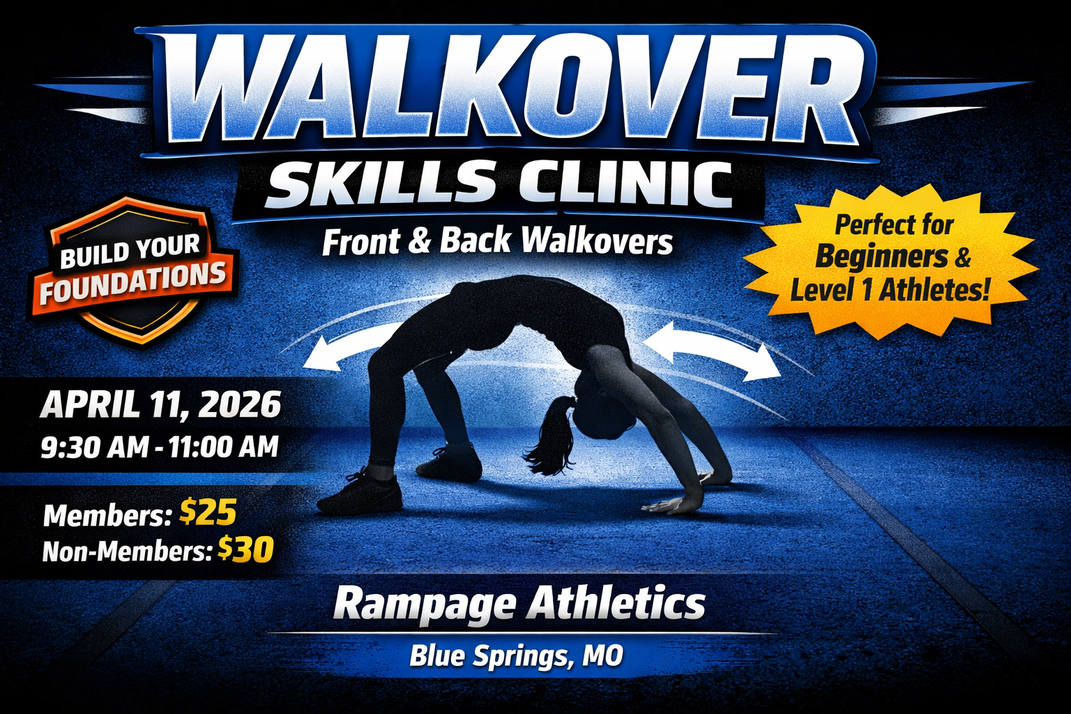Build strong foundations with front and back walkovers in a focused, high-energy clinic.